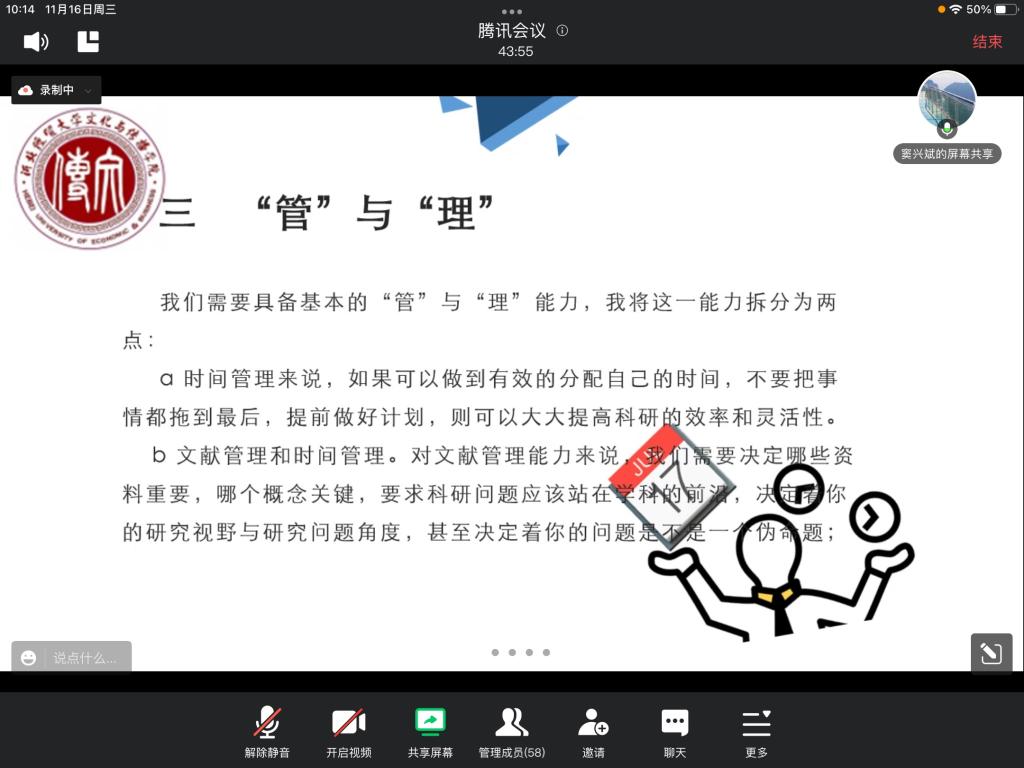 1116日上午,文化与传播学院窦兴斌副教授作题为按开学术之门的通用密码的“双百论坛”线上学术讲座。讲座由学院广播电视学系主任王黎燕主持,学院部分教师和究生60余人参加