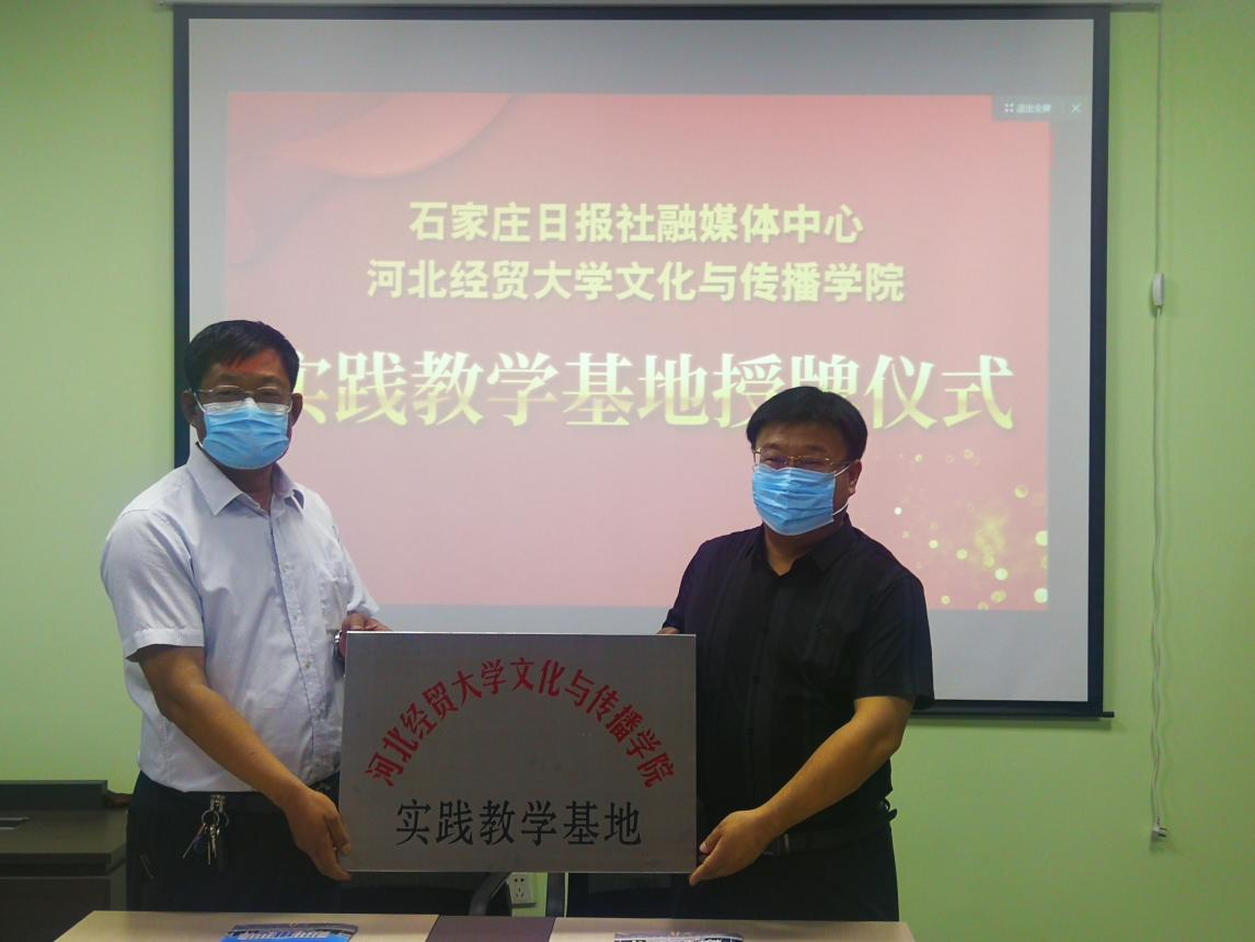 党委书记蔡金续为石家庄日报社融媒体中心、报晓网络科技有限公司“实践教学基地”授牌。双方还就产学研深度合作、校园文化品牌建设、专业实习实践等问题进行了广泛深入的交流座谈。