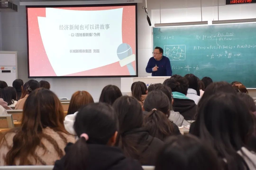 2月22日下午,文化与传播学院邀请长城新媒体集团视频部主任刘磊在第三教学楼A201作“财经记者面对面”第7期专题讲座,本次讲座主题为“经济类新闻也可以讲故事——以《百姓看联播》为例”,由院长景义新主持,学院各年级学生100余人参加。