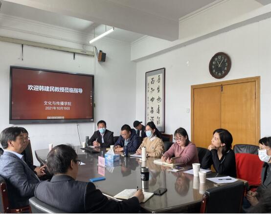 座谈会上,景义新首先代表学院向韩建民教授的到来表示欢迎,并介绍韩教授在出版领域做出的主要成就及突出贡献。韩建民从“科学与文化的关系”角度出发,通过生动的案例阐释文化对科学的重要性,并以科普出版和主题出版为切入点,提出“科学注入人文”的理念。随后,韩建民根据学院师生的兴趣点,在国家社科基金项目申报、高水平论文写作与发表、新闻传播学学科建设等方面进行了指导。他指出,申报国家社科基金项目的选题角度要新颖,要多研究国家政策,要经常参加学术交流会并请教专家,他结合自身“主题出版”工作与科研经验指出高水平论文撰写发表的注意事项。针对师生提出的“传统文化如何与新闻传播相结合”、“科学传播及相关选题研究”等问题,韩建民进行了耐心解答,他表示文化与传播研究可从地域特色出发,做到“小切口、大意义”,既要有理论建构,也要关照实践前沿。